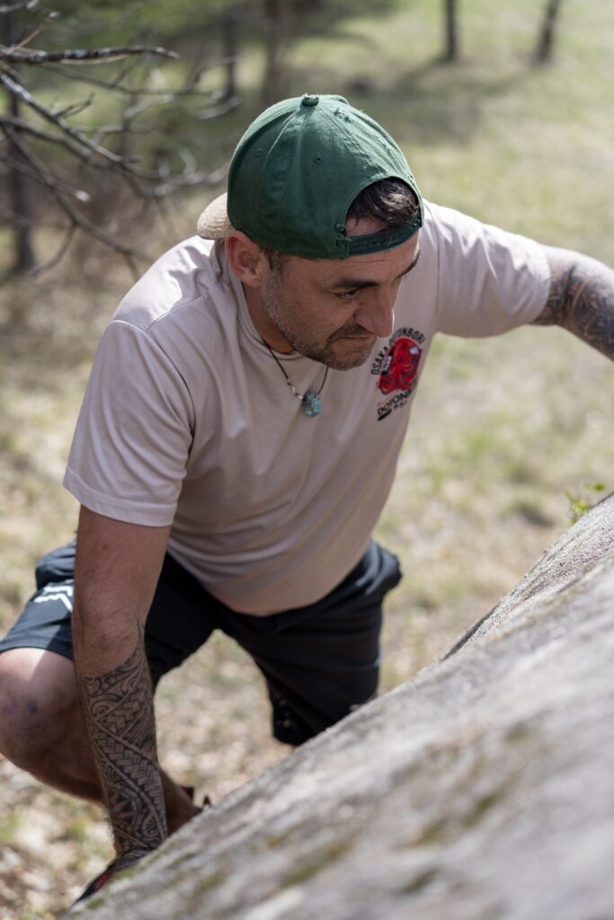 Certains grimpeurs du groupe bloc nous rejoignent et Maxime nous fait une petite démonstration sur la voie Papyrus en tête, non sans mal.