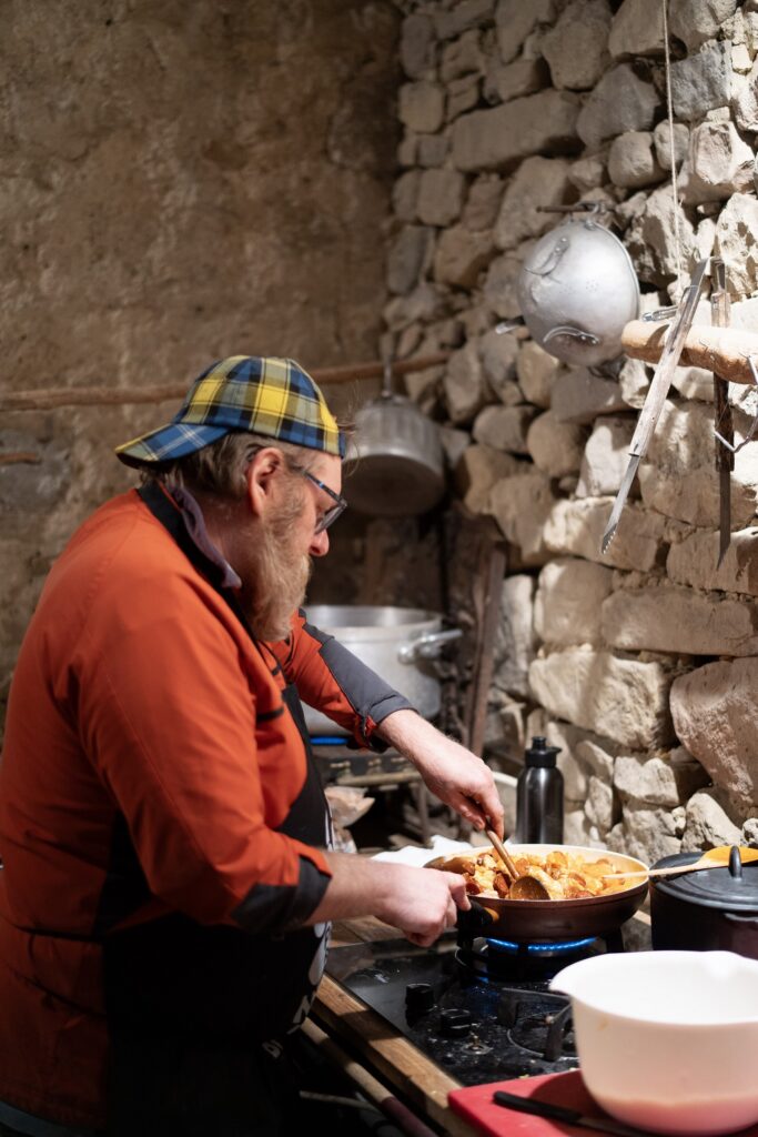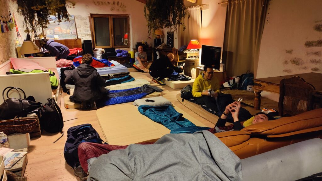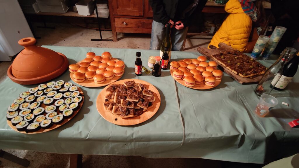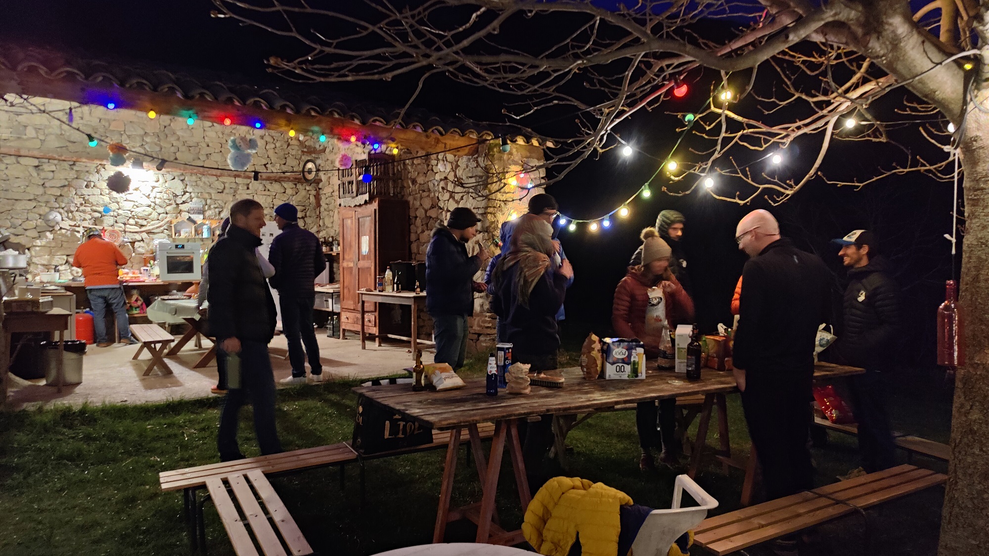 Nous nous y installons et commençons l’apéro pendant qu’Yves, ami d’enfance de Benji et chef cuisinier remarquable, est en train de nous concocter un repas qui, unanimement, nous a fait saliver de l’entrée au dessert. Sur la terrasse de la cuisine extérieure ou autour du grand feu juste en dessous, tout le monde passe une excellente soirée.