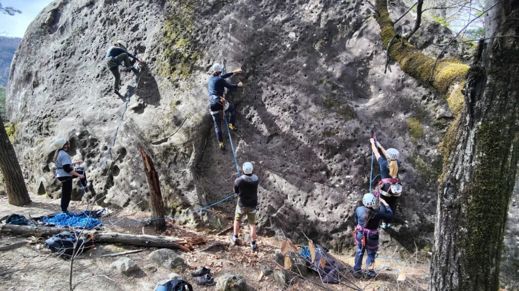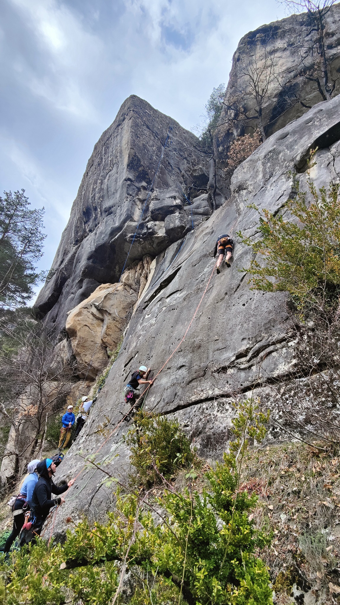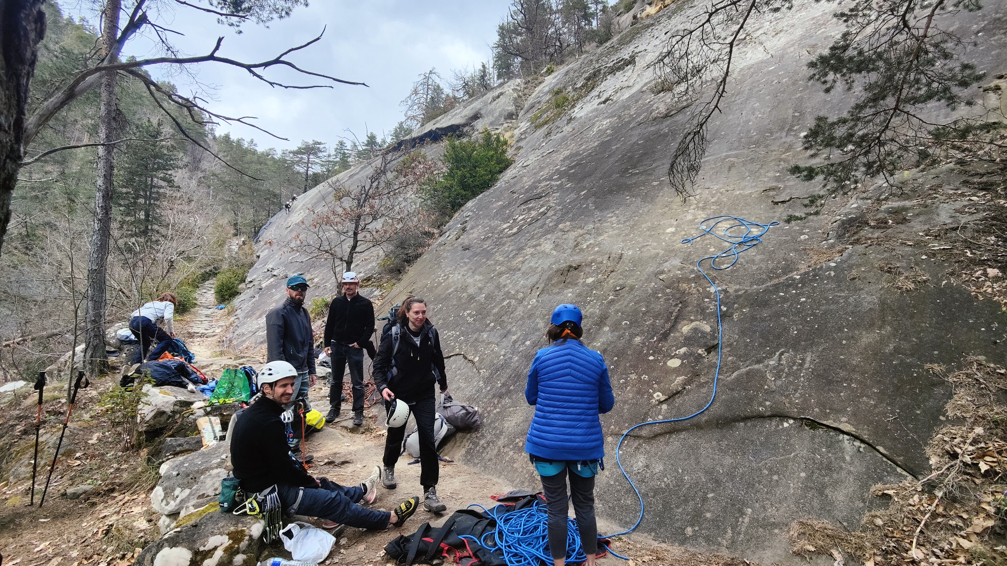 Sur le secteur Galopins, Claire, Céline, Pauline, Sarah, Axel et Cédric vont enchaîner toutes ces petites voies pour bien s’échauffer. En parallèle, Sylvain, Matthieu, Damien, Gabriele, P.A., Margot et Julien sont allés s’attaquer aux dalles du secteur des Pyramides.