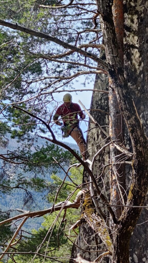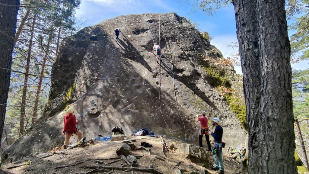 Quelques grimpeurs terminent le tour de la dalle pour achever les dernières voies, et nous nous déplaçons sur un autre secteur pour découvrir le Rocher de la Balme. Un peu caché, il faut jouer au sanglier pour y accéder. Mais pas longtemps car il est assez proche du sentier d’accès.