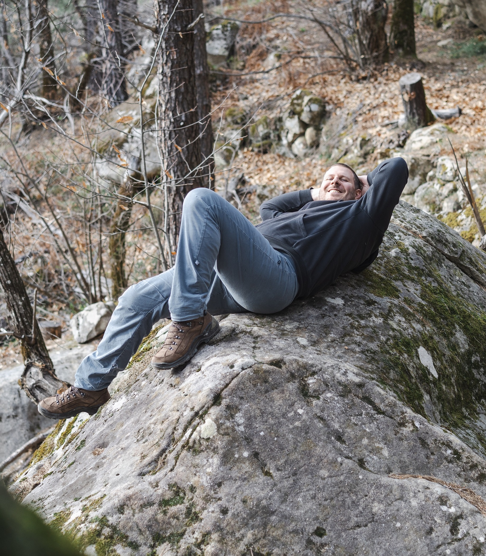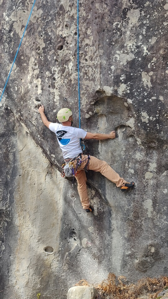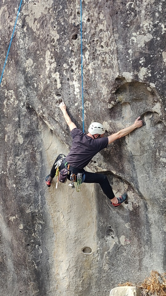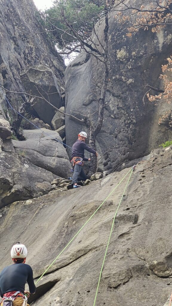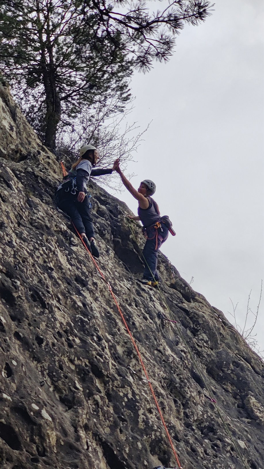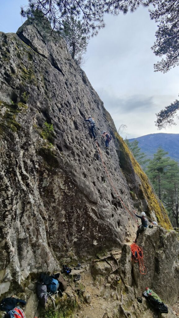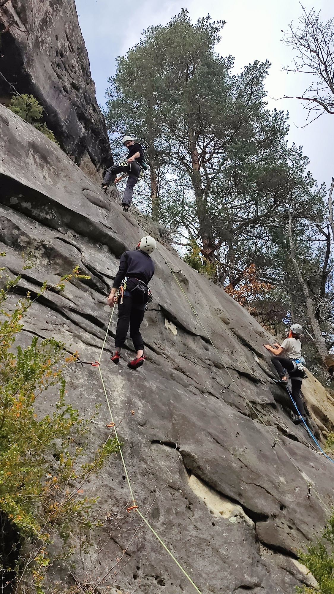Les cordes se posent et nous voilà au dernier acte de ce week-end. La grimpe est très variée sur ce secteur : légère dalle, verticalité, fissure, dévers et surplombs, il y a de tout.